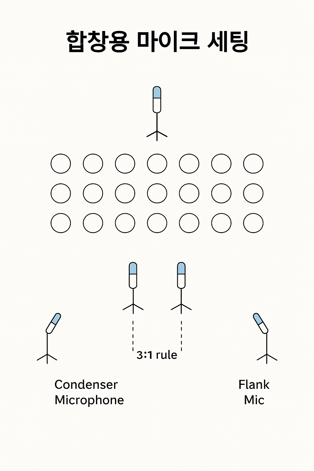 합창용 마이킹은 적은 수의 고감도 마이크를 높이·간격·각도를 조정하여 사용하고, 위상 간섭 방지(3:1 rule) 와 피드백 관리가 핵심입니다.