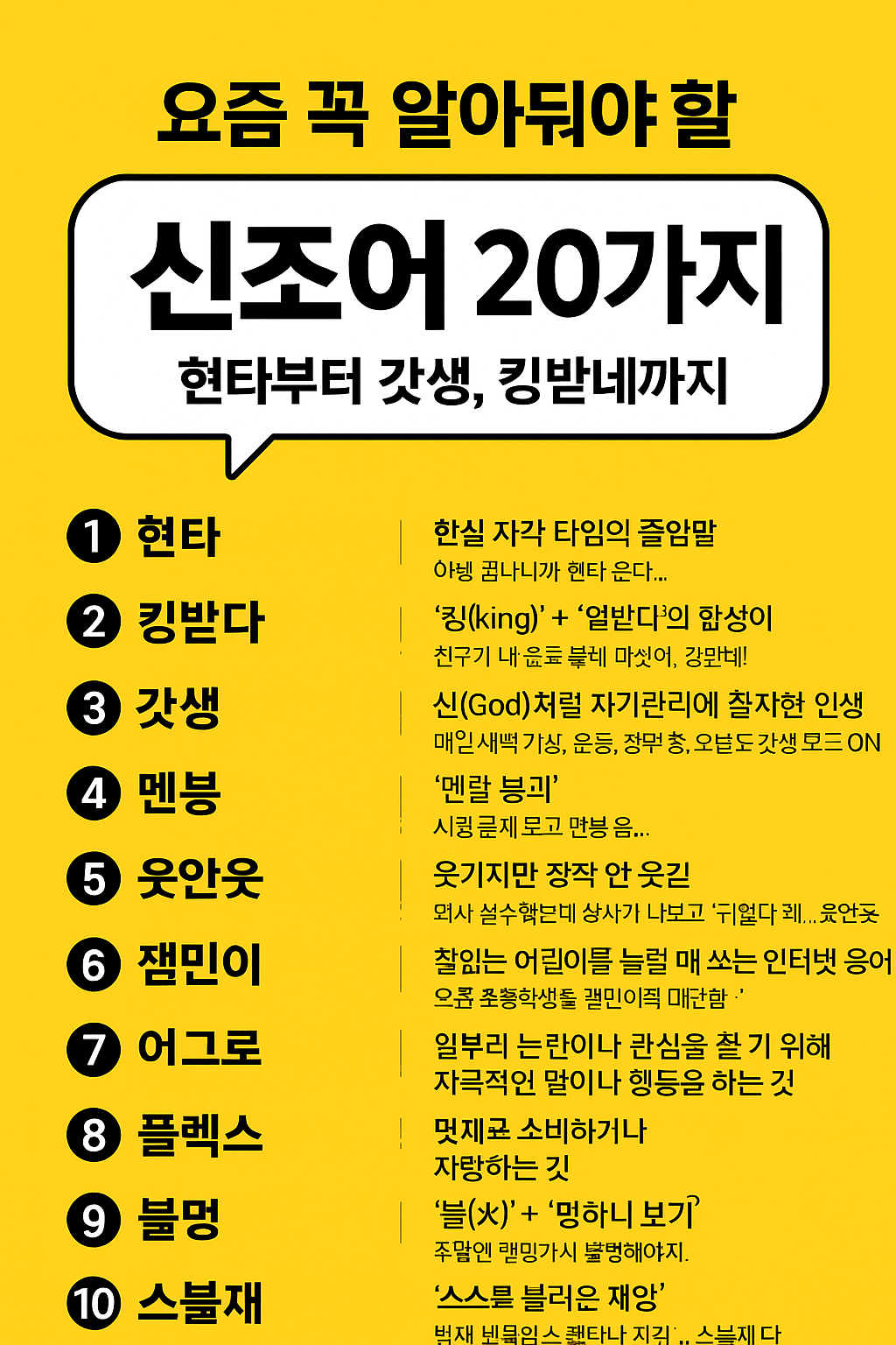 요즘(2025년 기준) 자주 쓰이는 신조어 20가지를 의미·예시와 함께 정리하였습니다